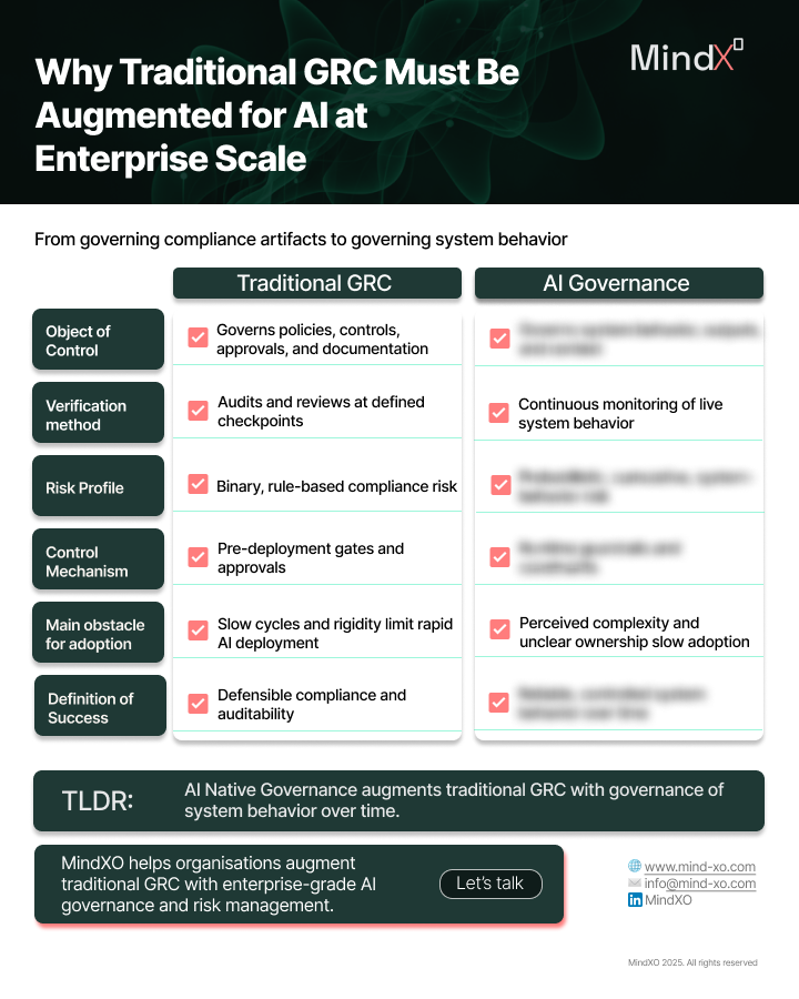 A one-page governance lens showing how traditional GRC is augmented for enterprise AI
